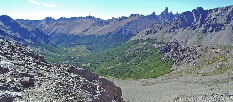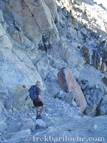 At the pass you have spectacular views over the Rucaco valley and the mighty glaciated Monte Tronador (3484m) in the distance. From the pass, the start of the trail is fairly obvious but is over loose rock and scree (Pay attention to the route markers and trail on the ground. Only precede if you're certain you are on the trail. If in doubt backtrack to the last seen marker to relocate the trail). The trail first descends to a section of easy scrambling then it's a traverse following red dots painted on the rocks until you reach 'Roca Inclinada' after about 2 hours. Pass through the 'Cancha de Futbol' (football pitch) an interesting flat (like a football pich - use a bit of imagination) col between the two valleys.