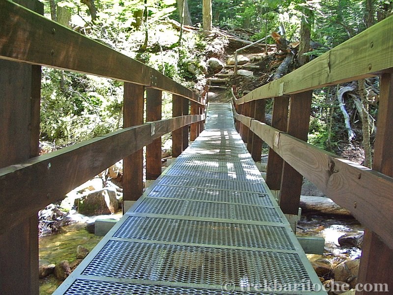 From the bus stop in the huge car park at the base of the Cerro Catedral ski resort, look for the wooden sign with 'FREY' written in big letters and the wooden carved backpacker (see photo below). The trail starts here. Head along the track away from the ski resort; after about 100m take the smaller trail signed off to the right. It crosses back over the vehicle track after about another 200m then forks to the right. Keep an eye out for the small signs bringing you onto the main trail. Once on this main trail, it's a very well marked path with excellent wooden and metal footbridges crossing a number of small stereams for about 1½ - 2 hours until you reach the path junction with the trail coming from Los Coihues. Keep heading up the valley for about another 1½ - 2 hours as the path starts to ascent into the forest, first crossing over the Van Titter stream on a larger metal footbridge, past Refugio Piedritas (a small shelter) before coming out above the tree line for the final kilometer to Refugio Frey.