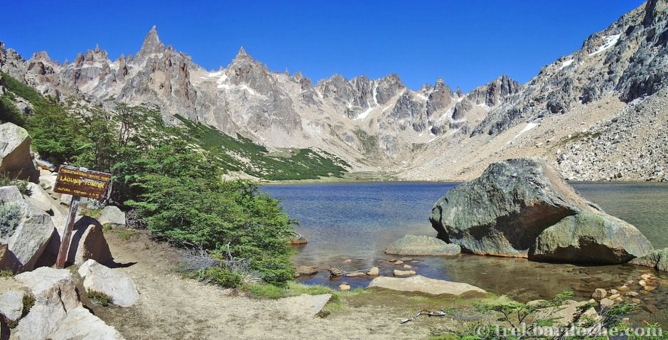 Still following the red dots, drop down (easy scramble) to Laguna Schmoll, then walk anti-clockwise around the lake for about 200m to a large minibus sized rock on the edge of the lake (there is a plaque on this rock). From here the trail follows the left hand side of the small stream flowing out of Laguna Schmall and zig-zags down one of numerous paths into the valley below. The trail countinues either to the left of the Laguna Toncek or crosses the flat bottomed valley to the right hand side of the laguna (take your pick!) arriving at Refugio Frey on the eastern shore of the Laguna Toncek.