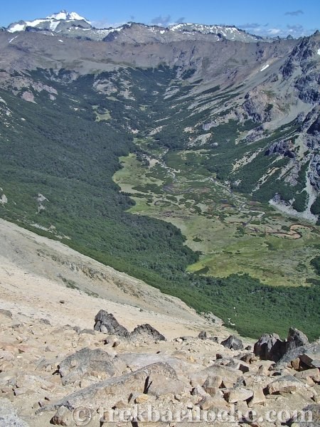 The trail starts from Camping Lago Gutierrez (just outside Los Coihues). The path goes parallel but much lower down to the Normal route, joining this main trail after about 2½ hours. Public transport goes to Los Cohiues (Bus no. 50) which is about 2 kms from the campsite. This route adds about another 250m of ascent compared to the Normal route.